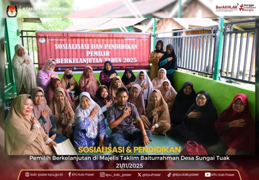 Halo #temanpemilih, KPU Kabupaten Paser melaksanakan Kegiatan Sosialisasi & Pendidikan Pemilih Berkelanjutan di Majelis Taklim Baiturrahman Desa Sungai Tuak, Jum'at (21/11/2025). Anggota KPU Kabupaten Paser, Hafida pada kesempatan tersebut menyampaikan pentingnya keterlibatan aktif perempuan dalam menyukseskan demokrasi. Sosialisasi ini mendapat sambutan baik oleh Ketua Majelis Taklim Baiturrahman, Ikhwati dan anggotanya. #KPUMelayani ....