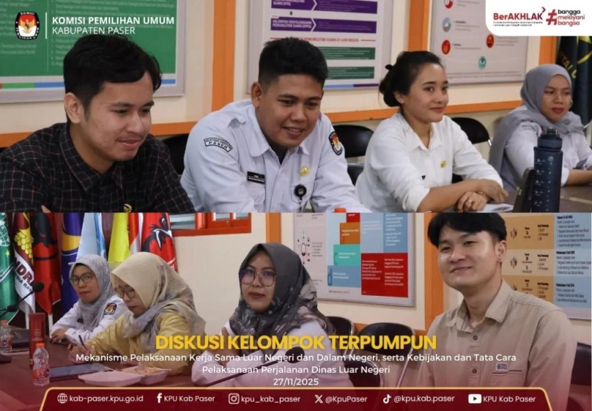 Halo #temanpemilih, KPU Kabupaten Paser mengikuti Diskusi Kelompok Tepumpun yang digelar oleh KPU RI secara Daring melalui Zoom Meeting di Ruang Rapat KPU Kabupaten Paser, Kamis(27/11/2025). Kegiatan ini membahas mekanisme pelaksanaan kerja sama luar negeri dan dalam negeri, serta kebijakan dan tata cara pelaksanaan perjalanan dinas luar negeri. #KPUMelayani ....