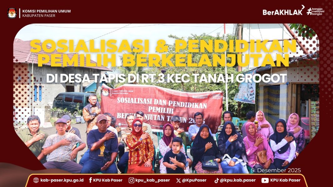 Halo #temanpemilih, KPU Kabupaten Paser melaksanakan kegiatan sosialisasi dan pendidikan pemilih berkelanjutan di Desa Tapis RT 3 Kecamatan Tanah Grogot, Jumat (05/12/2025).