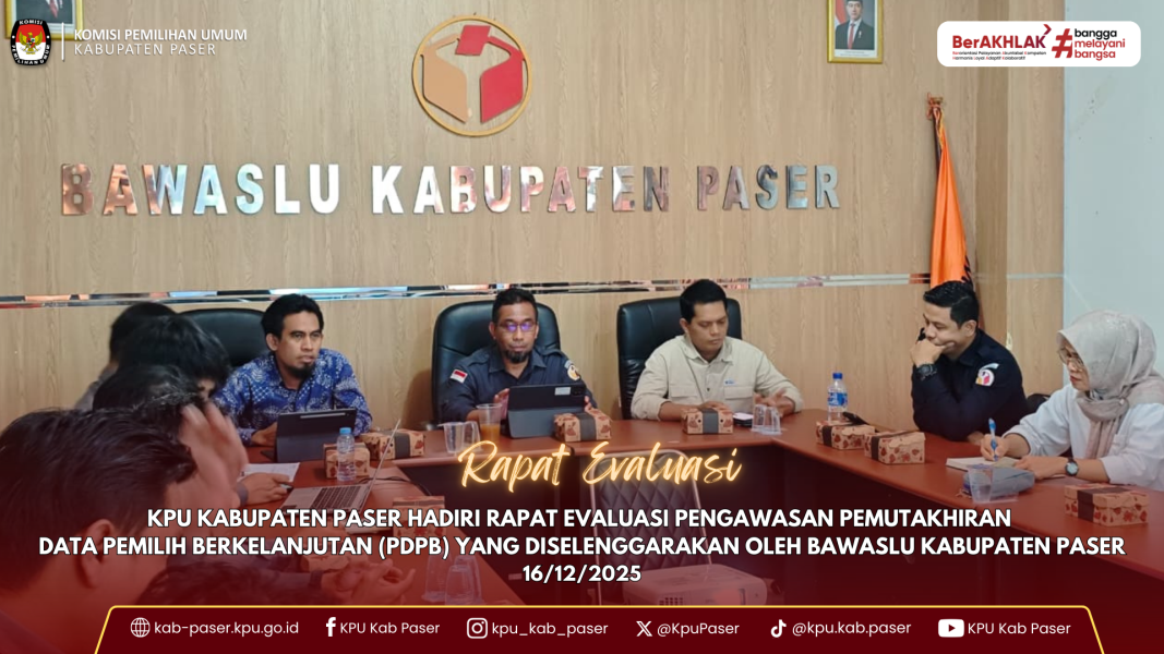 #temanpemilih, Selasa (16/12/2025) Komisi Pemilihan Umum Kabupaten Paser menghadiri Rapat Evaluasi Pengawasan Pemutakhiran Data Pemilih Berkelanjutan (PDPB) yang diselenggarakan oleh Bawaslu Kabupaten Paser yang bertempat di Kantor Bawaslu Kabupaten Paser.