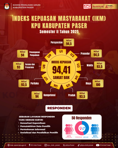 Komisi Pemilihan Umum (KPU) Kabupaten Paser merilis hasil survei Indeks Kepuasan Masyarakat (IKM) Semester II Tahun 2025. Berdasarkan hasil survei, KPU Kabupaten Paser memperoleh nilai IKM sebesar 94,41 yang masuk dalam kategori Sangat Baik, dengan total responden sejumlah 50 orang dari berbagai kalangan.