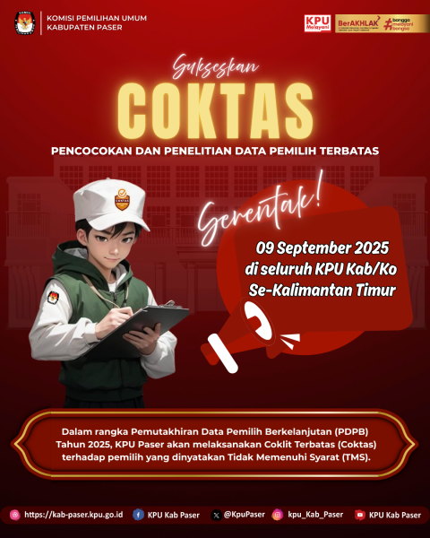 Ayo sukseskan Coktas (Coklit Terbatas) yang dimulai serentak se-Kalimantan Timur pada hari selasa, 09 September 2025 Apa itu Coktas? Coktas adalah vallidasi lapangan untuk pemilih yang Tidak Memenuhi Syarat (TMS) dalam DPT, seperti pemilih meninggal dunia, pindah domisili, atau data tidak padan. Proses ini dilakukan dengan kunjungan ke rumah pemilih, kantor, kelurahan, atau pihak terkait. Proses Teknis Coktas : - Koordinasi & Pengumpulan data TMS Melalui kemitraan dengan Dukcapil, Kelurahan, RT/RW; - Verifikasi Lapangan Petugas langsung mendatangi pemilih TMS atau keluarganya; - Pencocokan dan Penelitian Melibatkan pengecekan dokumen, wawancara keluarga, dan lain-lain; - Pemutakhiran Data Data diperbaharui sesuai hasil lapangan dan dilaporkan dalam PDPB. Fokus Validasi : 1. Pemilih yang telah meninggal dunia; 2. Pemilih yang pindah domisili; 3. Pemilih ganda/tidak padan; 4. Pemilih dengan status TMS lainnya. Dasar hukum: Undang-undang Nomor 7 Tahun 2017 tentang Pemilu Peraturan KPU Nomor 1 Tahun 2025 tentang PDPB Dengan adanya COKTAS, daftar pemilih akan semakin bersih, valid, akurat, dan mutakhir, sehingga pelaksanaan Pemilu ke depan dapat berjalan lebih baik dan terpercaya. Mari kita dukung bersama, karena data pemilih yang akurat adalah kunci sukses Pemilu yang demokratis! 'Pastikan data anda terdaftar dalam data pemilih. Cek hak pilihmu di cekdptonline.kpu.go.id' #Coktas2025 #KPUPaser #KPUMelayani
