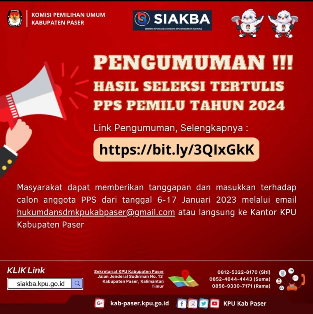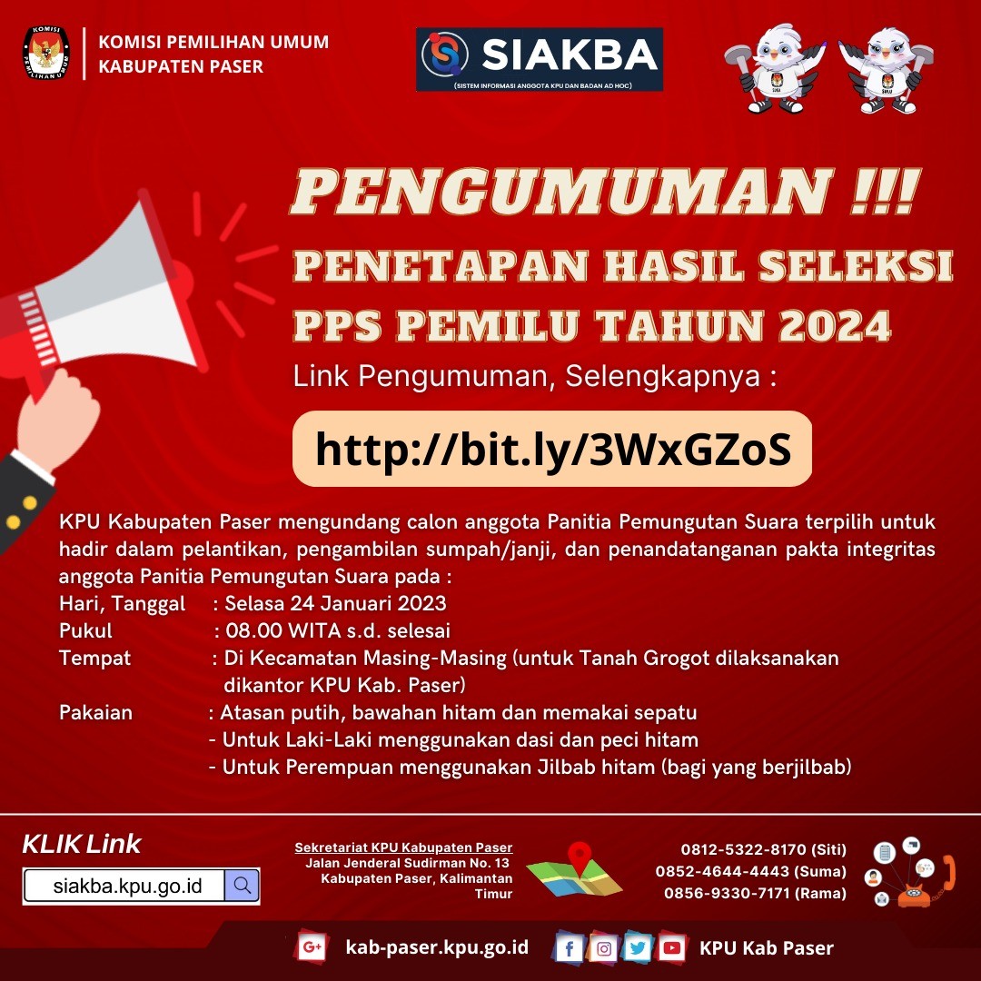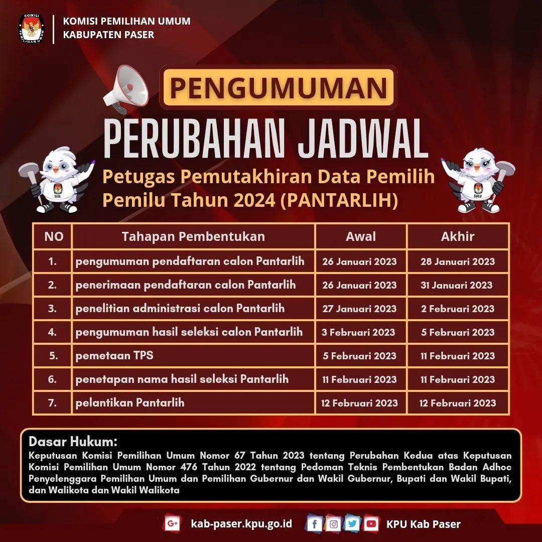 PASER (07/02/2023) - Sehubungan dengan terbitnya Keputusan Komisi Pemilihan Umum Nomor 67 Tahun 2023 tentang Perubahan Kedua atas Keputusan Komisi Pemilihan Umum Nomor 476 Tahun 2022 tentang Pedoman Teknis Pembentukan Badan Adhoc Penyelenggara Pemilihan Umum dan Pemilihan Gubernur dan Wakil Gubernur, Bupati dan Wakil Bupati, dan Walikota dan Wakil Walikota dan menindaklanjuti Surat Dinas Ketua Komisi Pemilihan Umum Republik Indonesia Nomor 145/PP.04.1-SD/04/2023 tentang Penyesuaian Jadwal Pembentukan dan Masa Kerja Pantarlih untuk Pemilu 2024, bersama ini disampaikan hal-hal sebagai berikut : 1. Bahwa KPU Kabupaten Paser bersama dengan Panitia Pemilihan Kecamatan (PPK) pada 10 kecamatan se-Kabupaten Paser dan Panitia Pemungutan Suara pada 144 kelurahan/desa se-Kabupaten Paser akan melaksanakan agenda restrukturisasi dan pemetaan Tempat Pemungutan Suara (TPS) untuk Pemilu Tahun 2024 pada tanggal 5 sampai dengan tanggal 11 Februari 2023; 2. Bahwa terdapat perubahan jadwal Pembentukan Pantarlih sebagai berikut : Pengumuman pendaftaran calon Pantarlih : 26 Januari 2023 s.d. 28 Januari 2023 Penerimaan pendaftaran calon Pantarlih : 26 Januari 2023 s.d. 31 Januari 2023 Penelitian administrasi calon Pantarlih : 27 Januari 2023 s.d. 2 Februari 2023 Pengumuman hasil seleksi calon Pantarlih : 3 Februari 2023 s.d. 5 Februari 2023 Pemetaan TPS : 5 Februari 2023 s.d. 11 Februari 2023 Penetapan nama hasil seleksi Pantarlih : 11 Februari 2023 Pelantikan Pantarlih : 12 Februari 2023 Masa Kerja Pantarlih : 12 Februari 2023 s.d. 11 April 2023 3. Bahwa jadwal Penetapan Hasil Seleksi Pantarlih dari semula pada tanggal 5 Februari 2023 menjadi tanggal 11 Februari 2023; 4. Bahwa terdapat penyesuaian nama-nama Pantarlih yang ditetapkan sesuai dengan hasil pemetaan TPS yang sudah dilakukan; 5. Bahwa jadwal Pelantikan Pantarlih dari semula tanggal 6 Februari 2023 menjadi tanggal 12 Februari 2023; 6. Bahwa terdapat penyesuaian dan penambahan masa kerja Pantarlih dari semula tanggal 6 Februari 2023 sampai dengan tanggal 15 Maret 2023 menjadi 12 Februari 2023 sampai dengan 11 April 2023. Demikian pengumuman ini disampaikan untuk diketahui. Paser, 7 Februari 2023 Ketua Komisi Pemilihan Umum Kabupaten Paser, tertanda Abdul Qayyim Rasyid