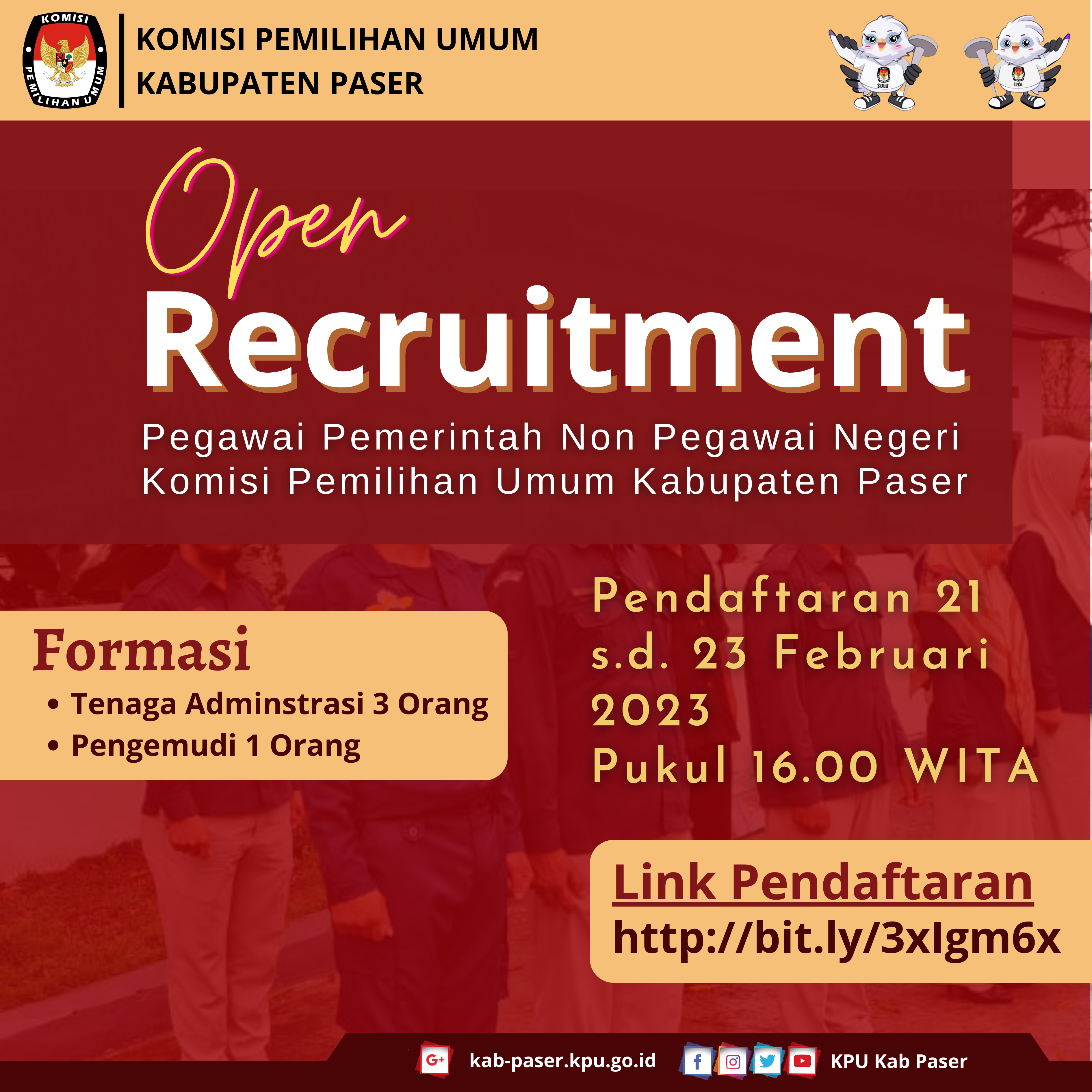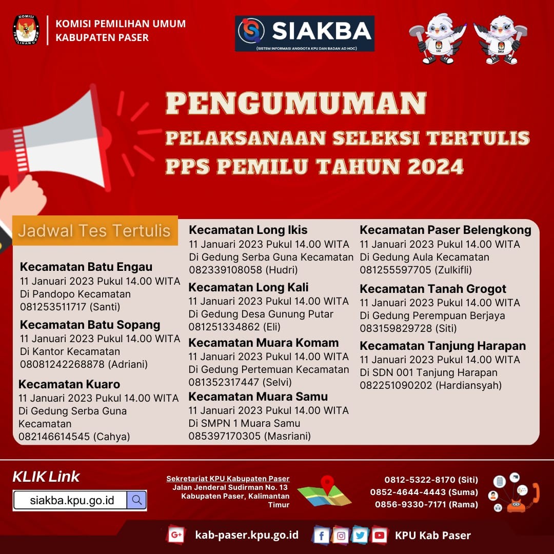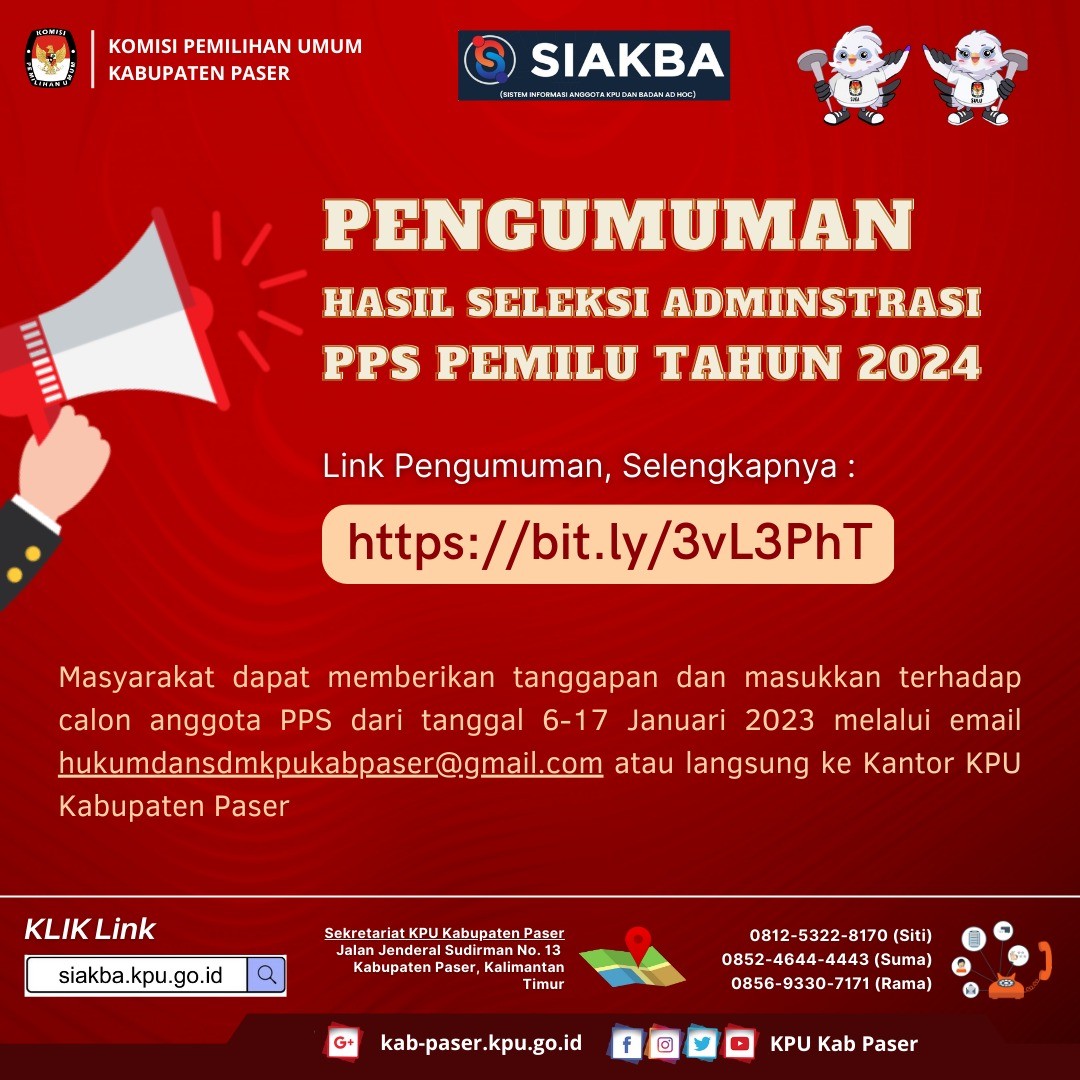 PASER (07/02/2023) - Sehubungan dengan terbitnya Keputusan Komisi Pemilihan Umum Nomor 67 Tahun 2023 tentang Perubahan Kedua atas Keputusan Komisi Pemilihan Umum Nomor 476 Tahun 2022 tentang Pedoman Teknis Pembentukan Badan Adhoc Penyelenggara Pemilihan Umum dan Pemilihan Gubernur dan Wakil Gubernur, Bupati dan Wakil Bupati, dan Walikota dan Wakil Walikota dan menindaklanjuti Surat Dinas Ketua Komisi Pemilihan Umum Republik Indonesia Nomor 145/PP.04.1-SD/04/2023 tentang Penyesuaian Jadwal Pembentukan dan Masa Kerja Pantarlih untuk Pemilu 2024, bersama ini disampaikan hal-hal sebagai berikut : 1. Bahwa KPU Kabupaten Paser bersama dengan Panitia Pemilihan Kecamatan (PPK) pada 10 kecamatan se-Kabupaten Paser dan Panitia Pemungutan Suara pada 144 kelurahan/desa se-Kabupaten Paser akan melaksanakan agenda restrukturisasi dan pemetaan Tempat Pemungutan Suara (TPS) untuk Pemilu Tahun 2024 pada tanggal 5 sampai dengan tanggal 11 Februari 2023; 2. Bahwa terdapat perubahan jadwal Pembentukan Pantarlih sebagai berikut : Pengumuman pendaftaran calon Pantarlih : 26 Januari 2023 s.d. 28 Januari 2023 Penerimaan pendaftaran calon Pantarlih : 26 Januari 2023 s.d. 31 Januari 2023 Penelitian administrasi calon Pantarlih : 27 Januari 2023 s.d. 2 Februari 2023 Pengumuman hasil seleksi calon Pantarlih : 3 Februari 2023 s.d. 5 Februari 2023 Pemetaan TPS : 5 Februari 2023 s.d. 11 Februari 2023 Penetapan nama hasil seleksi Pantarlih : 11 Februari 2023 Pelantikan Pantarlih : 12 Februari 2023 Masa Kerja Pantarlih : 12 Februari 2023 s.d. 11 April 2023 3. Bahwa jadwal Penetapan Hasil Seleksi Pantarlih dari semula pada tanggal 5 Februari 2023 menjadi tanggal 11 Februari 2023; 4. Bahwa terdapat penyesuaian nama-nama Pantarlih yang ditetapkan sesuai dengan hasil pemetaan TPS yang sudah dilakukan; 5. Bahwa jadwal Pelantikan Pantarlih dari semula tanggal 6 Februari 2023 menjadi tanggal 12 Februari 2023; 6. Bahwa terdapat penyesuaian dan penambahan masa kerja Pantarlih dari semula tanggal 6 Februari 2023 sampai dengan tanggal 15 Maret 2023 menjadi 12 Februari 2023 sampai dengan 11 April 2023. Demikian pengumuman ini disampaikan untuk diketahui. Paser, 7 Februari 2023 Ketua Komisi Pemilihan Umum Kabupaten Paser, tertanda Abdul Qayyim Rasyid