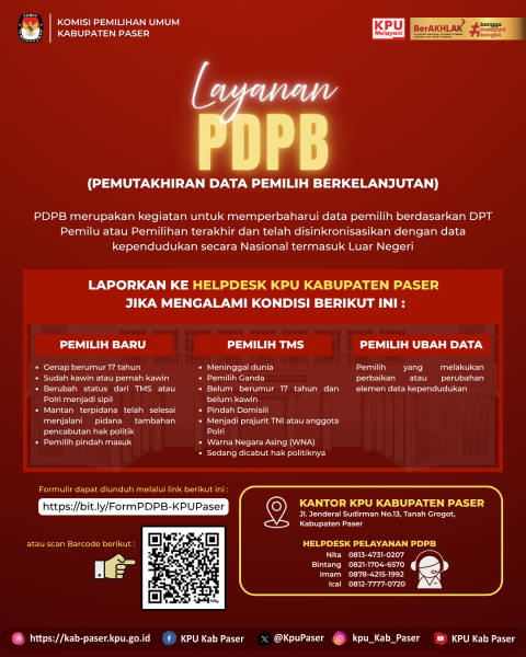 #TemanPemilih, KPU Kabupaten Paser membuka posko layanan Pemutakhiran Data Pemilih Berkelanjutan (PDPB). Bagi Masyarakat Kabupaten Paser yang memenuhi salah satu dari kriteria berikut ini: