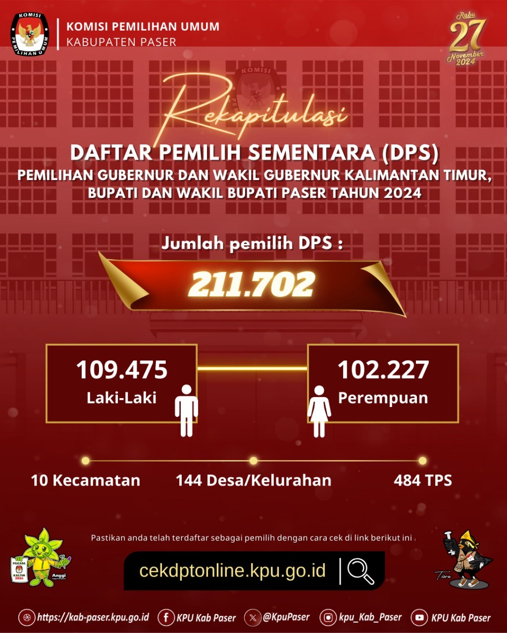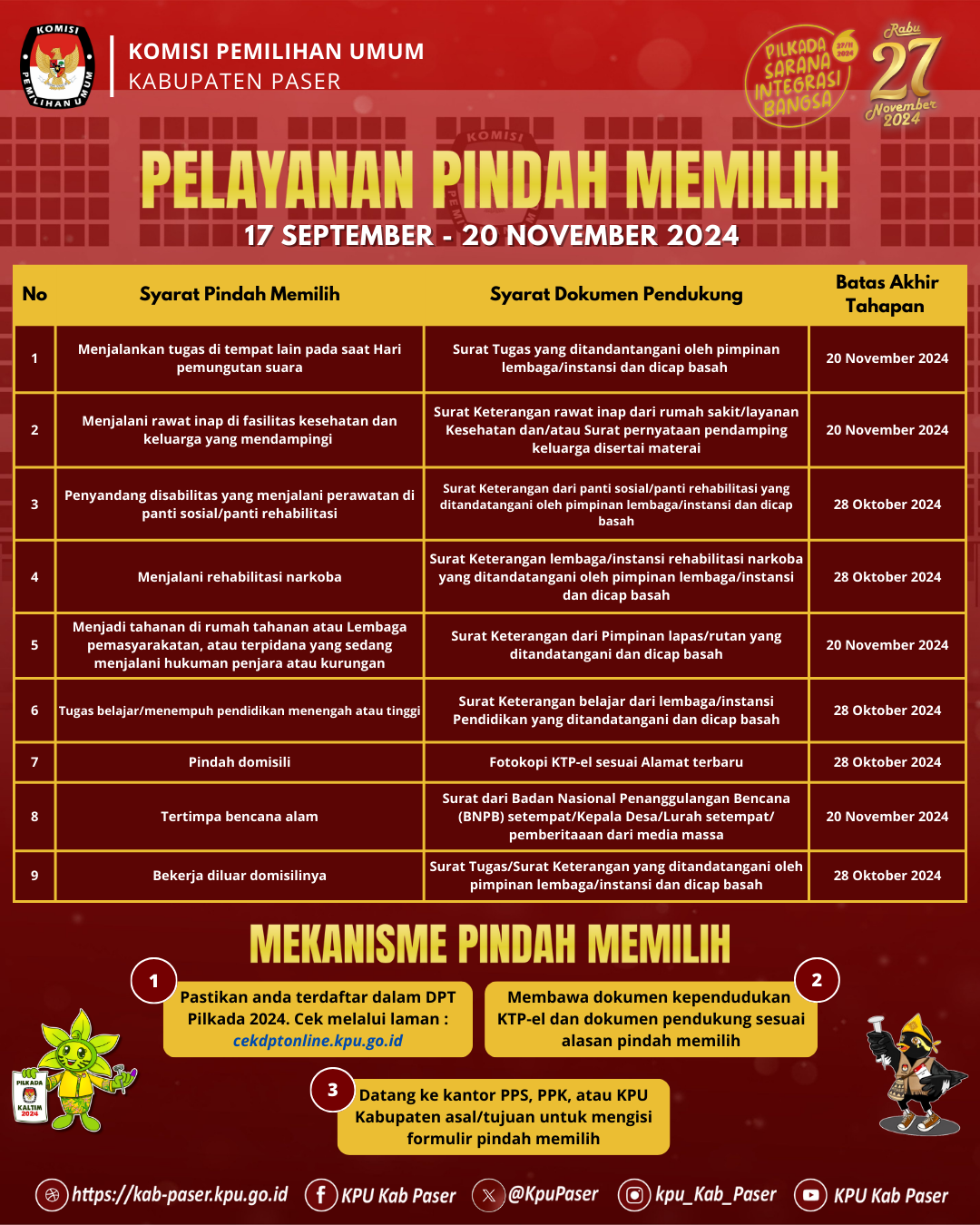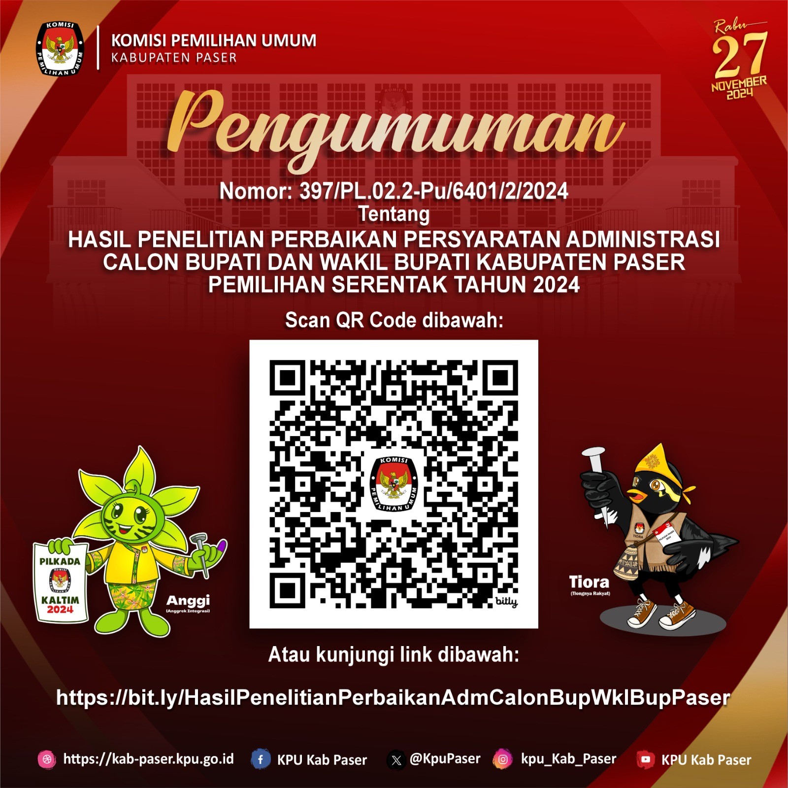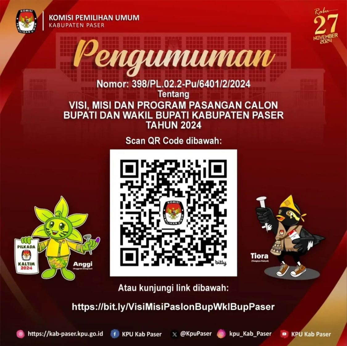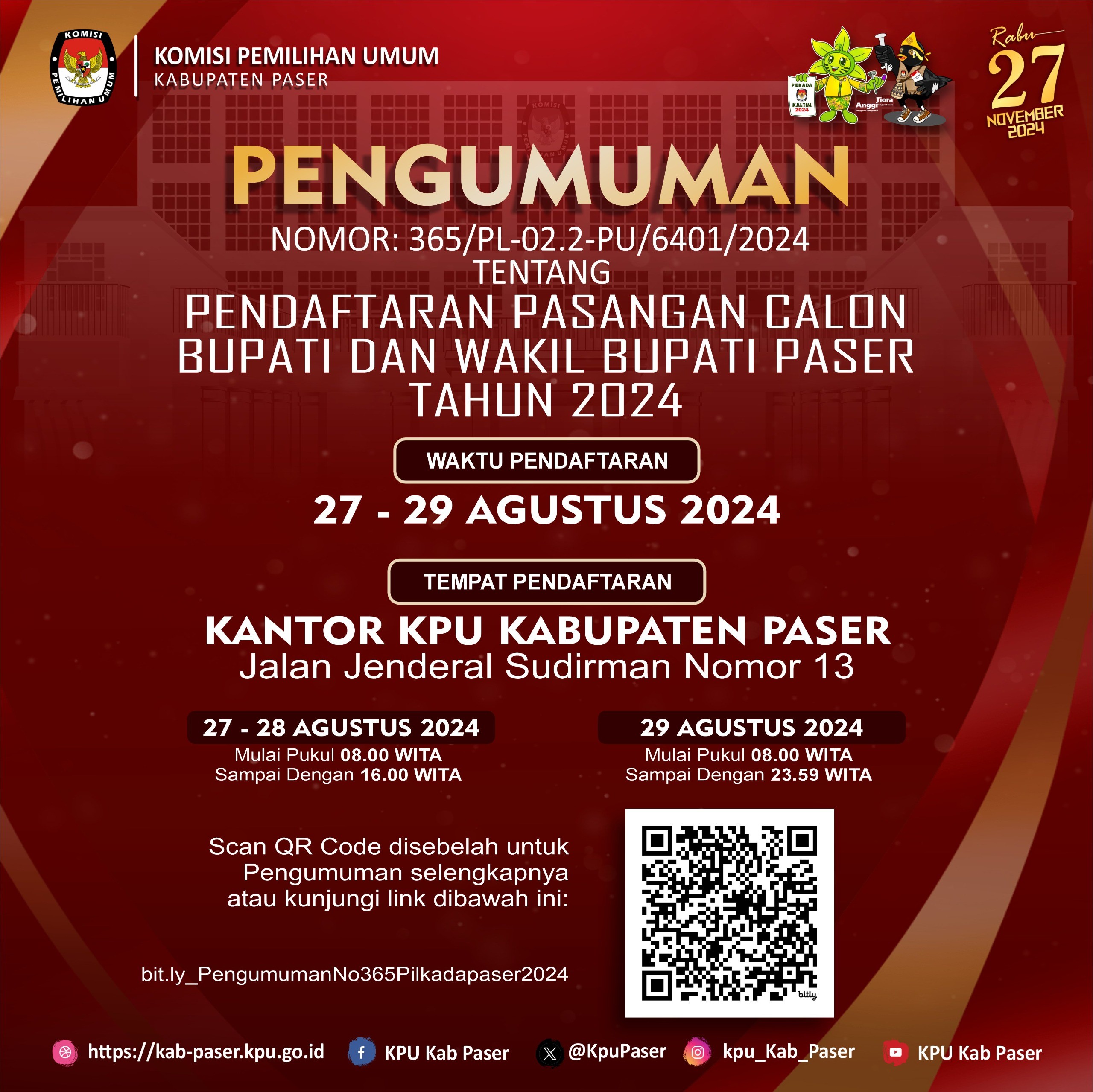 Bahwa untuk melaksanakan ketentuan Pasal 95 Ayat (1) Peraturan Komisi Pemilihan Umum Republik Indonesia Nomor 8 Tahun 2024 tentang Pencalonan Pemilihan Gubernur dan Wakil Gubernur, Bupati dan Wakil Bupati, serta Wali Kota dan Wakil Wali Kota, Komisi Pemilihan Umum Kabupaten Paser mengumumkan informasi dan jadwal pendaftaran Bakal Pasangan Calon Bupati dan Wakil Bupati Paser pada Pemilihan Bupati dan Wakil Bupati Paser Tahun 2024 sebelum masa pendaftaran dibuka. Untuk informasi lebih lanjut dapat mengunduh pengumuman pada link di bawah ini: