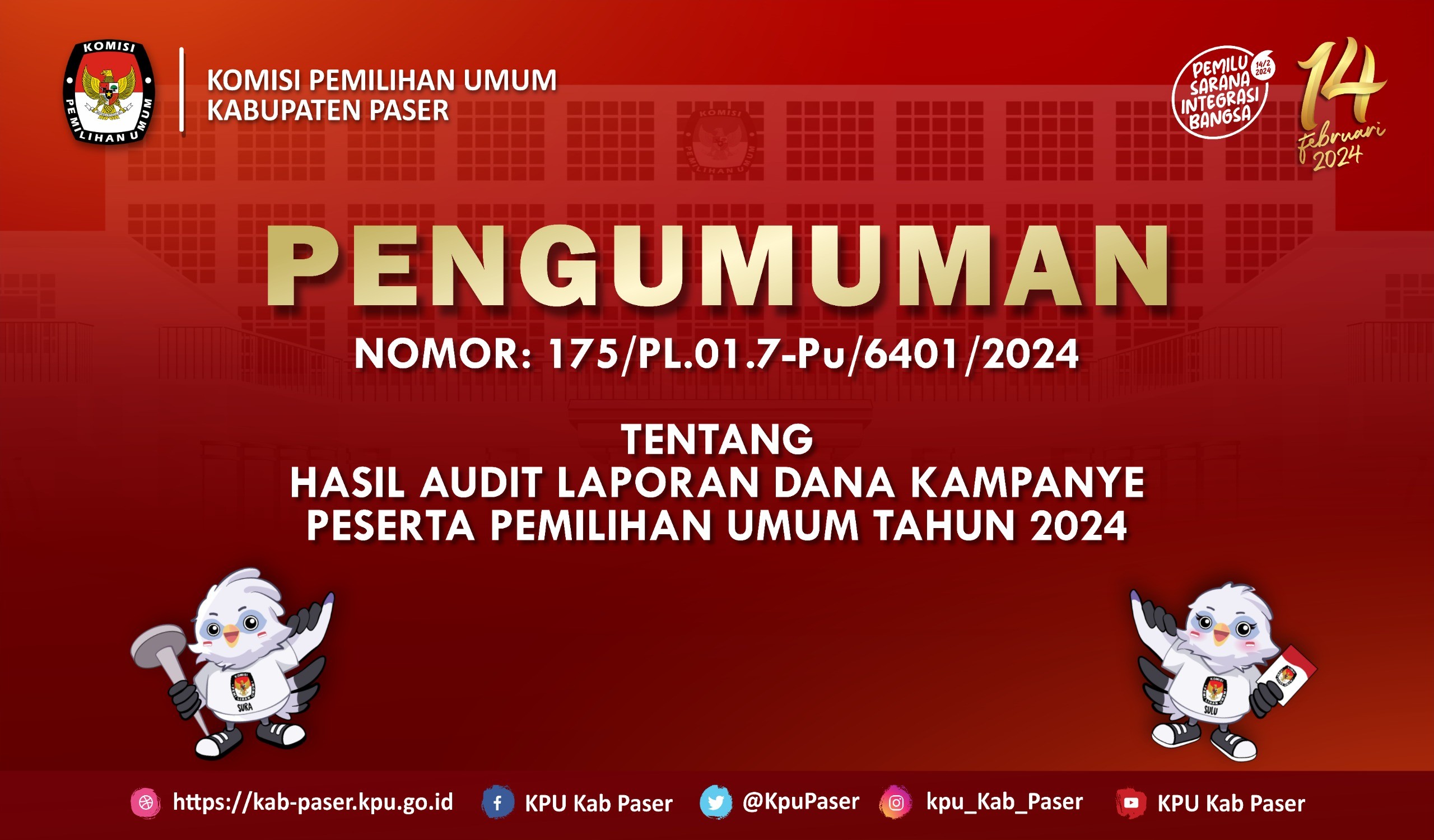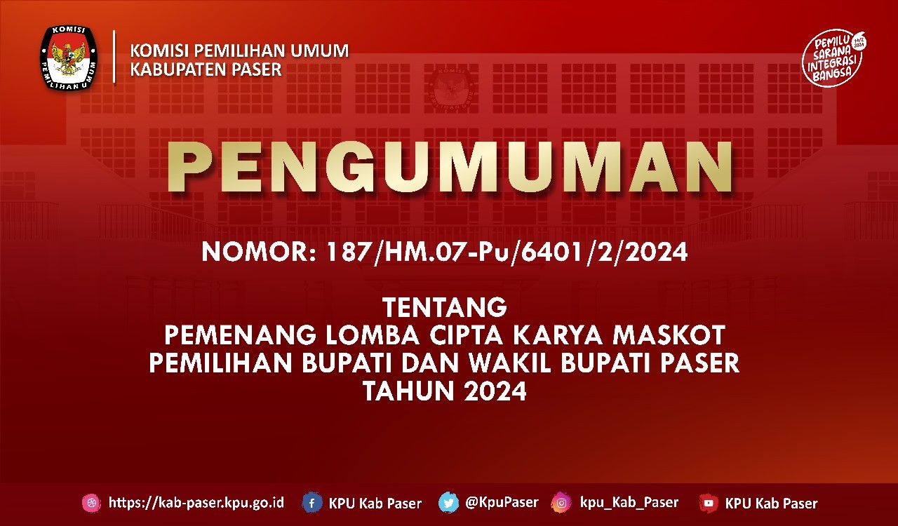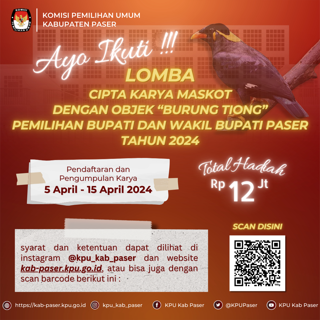 #TemanPemilih, ayo ikuti lomba cipta karya Maskot dengan Objek "Burung Tiong" untuk Pemilihan Bupati dan Wakil Bupati Paser tahun 2024. Untuk syarat dan ketentuan dapat dilihat pada link berikut ini :